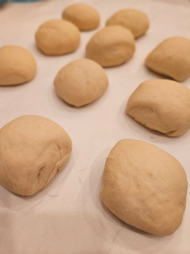 By hand, shape each chunk to a ball. If the dough has 'cracks' or uneven spots, you can stretch those towards the bottom and roll the chunk into a ball, gradually pressuring the chunk to shape it to a circle.