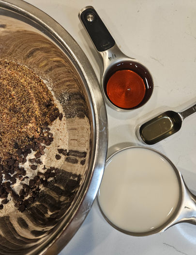 In a mixing bowl place the dry ingredients (flour, chocolate chips and flaxseed meal) and mix well.