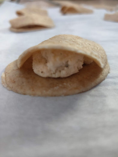 Lay the rolled dough flat on a clean surface. Use a circular cookie cutter (2-3 inches in diameter) or cut the dough longitudinally, to get a long rectangle. If using two different fillings, it can help to use different shapes to distinguish them.
