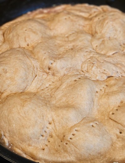 Cover the dish in the pan with dough - so that the dough literally acts like a blanket. Tuck those edges of the dough in the circumference of the pan, using a wooden spoon.