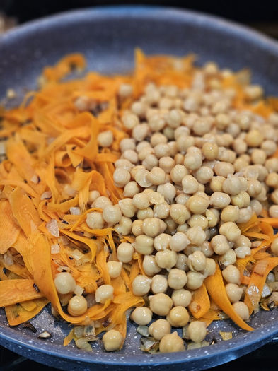 Add the carrot ribbons and stir to coat it well with the oil and spices (except for the silan).