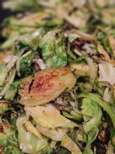 On a nonstick pan, with 1 tbsp of vegetable oil of your choice, toss the brussel sprouts in and add a sprinkle of salt.